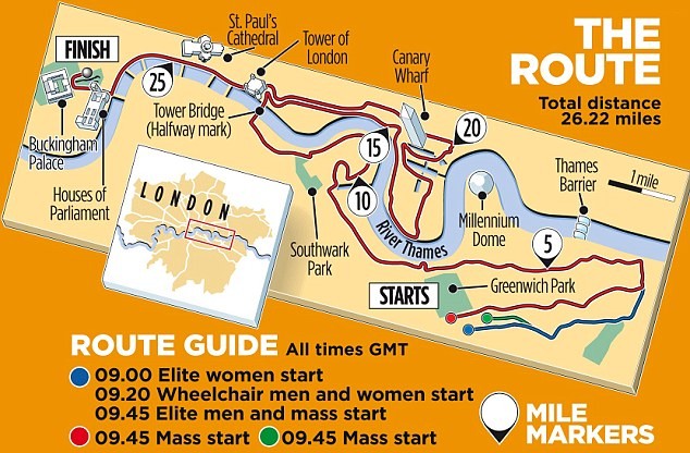 Prime viewing spots are on Tower Bridge, where the course doubles back on itself after it goes north of the River Thames, the Victoria Embankment, where many of the runners start to flag, and the final mile around St James’s Park.